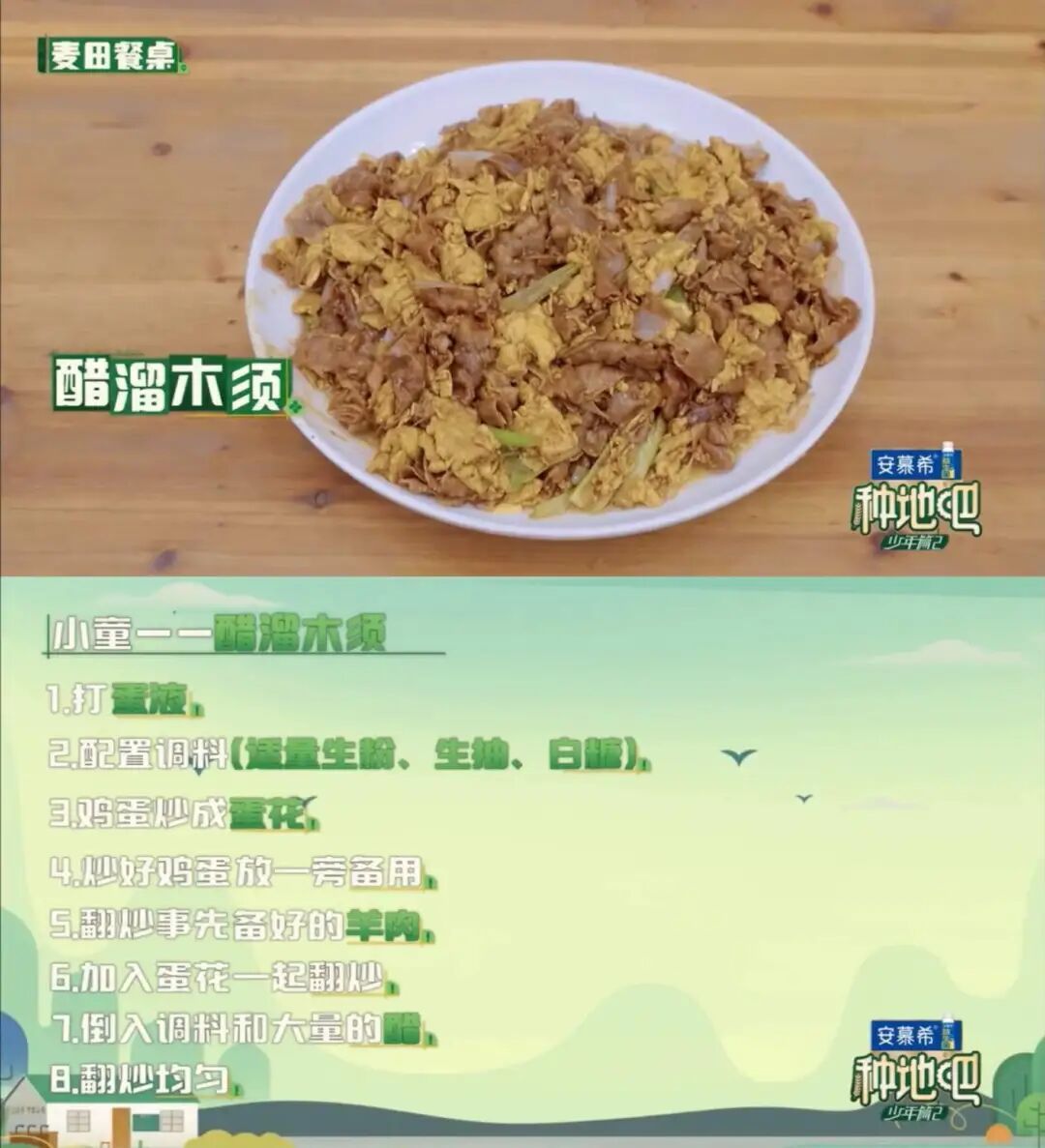 综艺《种地吧第二季》里赵小童做了一道醋溜木须,他和其他人介绍醋溜木须是北京名菜,其中木须是鸡蛋的意思,这道菜就是把羊肉和鸡蛋炒在一起。