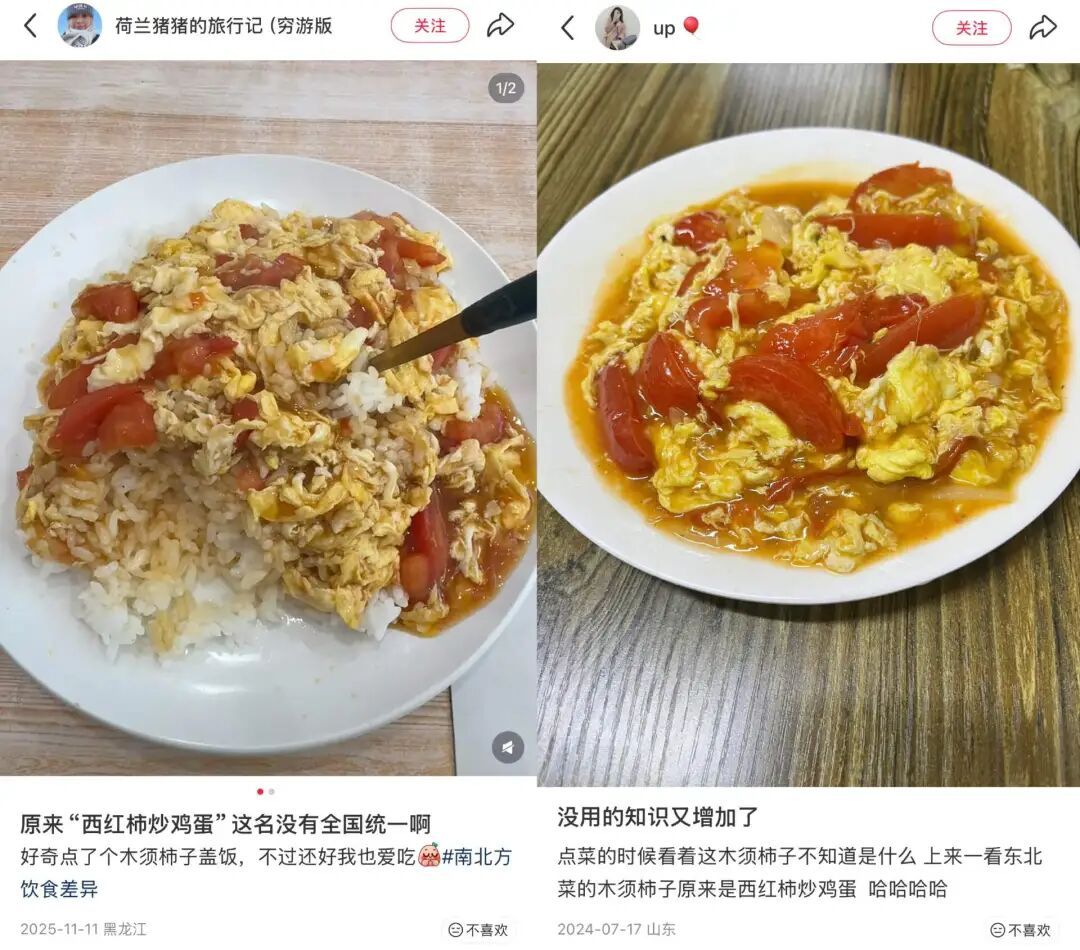 还有网友分享了自己到饭馆点木须柿子的经历,结果端上来的是西红柿炒鸡蛋。柿子就是西红柿,而木须则指鸡蛋。