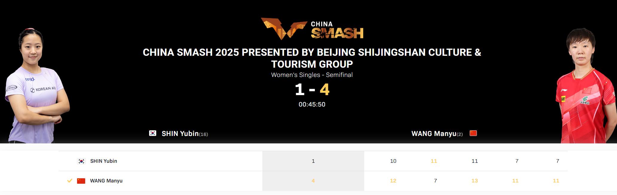 韩国媒体《SportalKorea》赛后发文:中国成长很高,申裕斌在半决赛受挫无缘决赛,面对世界排名第二的王曼昱1-4败北,北京大满贯女单以4强神话结束。